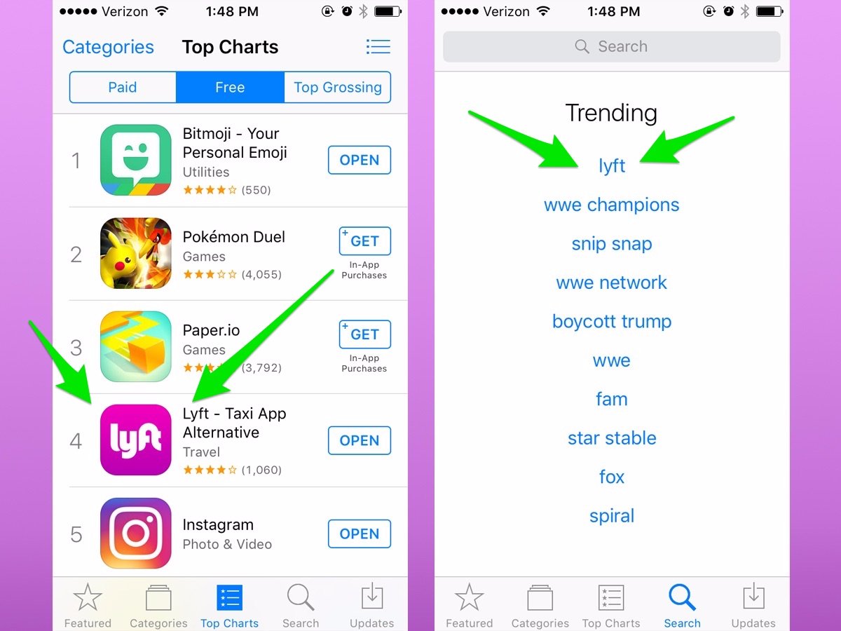 Tồi tệ hơn nữa cho Uber mọi người còn hè nhau chuyển sang ứng dụng chạy xe tương tự Lyft, khiến ứng dụng này đạt lượng tải kỷ lục trên app vào chủ nhật. Vào thứ Hai, ứng dụng này đã vượt mặt Uber, xếp thứ 4 strong top các ứng dụng tải trên iOS strong khi Uber tụt xuống thư 13.Sáng lập của Lyft là John Zimmer và Logan Green hứa sẽ quyên 1 triệu USD, cho tổ chức ACLU nhằm giúp đỡ những người có chỗ ở tạm thời tại Hoa Kỳ.
